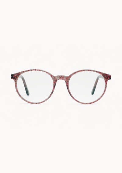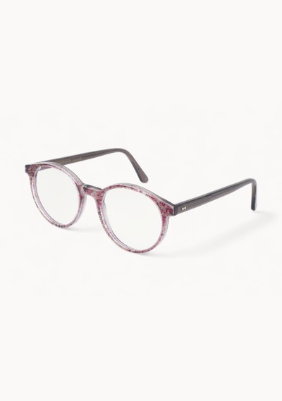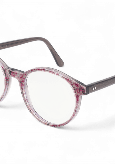 In dieser Brille sind getrocknete rosa Kornblumen verarbeitet.